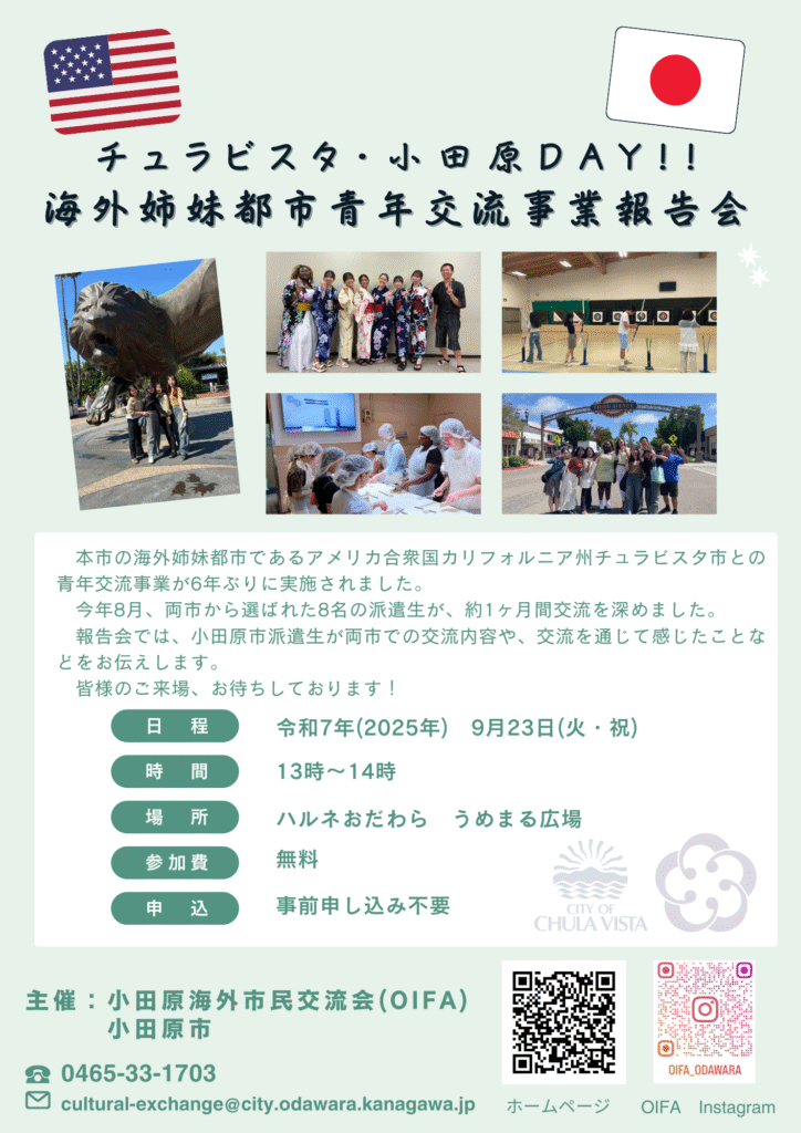 報告会では小田原市派遣生がチュラビスタ市や交流についてご紹介します。皆様のご来場をお待ちしております!